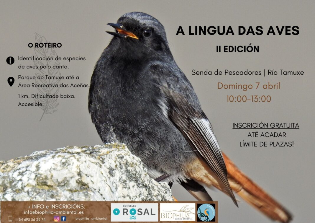 A actividade celebrarase o domingo 7 de abril, con saída ás 10.00 horas dende o parque do Tamuxe e remate ás 13.00 horas na área recreativa das Aceñas. Trátase dun percorrido dun quilómetro de dificultade baixa e totalmente accesible no que as e os participantes achegaranse á lingua das aves a través de contidos teóricos e prácticos adaptados ao público.