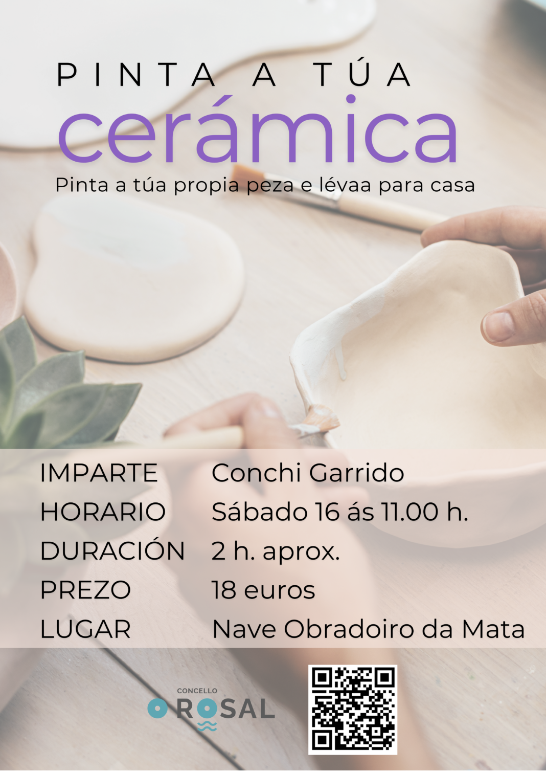 O taller terá lugar o vindeiro sábado 16 de novembro ás 11.00 horas na Nave Obradoiro da Mata, aproximadamente dúas horas para que as persoas interesadas decoren unha peza cerámica que ao remate poderán levar para casa. Organizado pola OMIX do Rosal, aínda que o taller está dirixido a público de todas as idades terán prioridade á hora da inscrición as persoas menores de 30 anos.