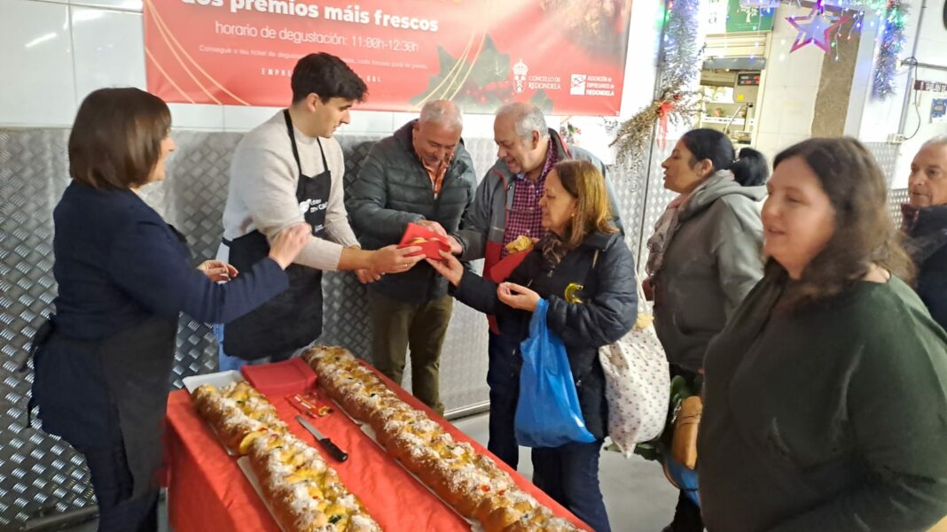 Ducias de persoas participaron hoxe na Praza de Abastos de Redondela na degustación do roscón xigante “cos premios máis frescos” para os seus clientes e clientas. O Concello ofreceu ao público un roscón xigante onde se agochaban 24 figuras premiadas. Produtos frescos como peixe ou polo, froitas, vales de compra ou almorzos foron algúns dos premios dados polos praceiros e praceiras que recolleron hoxe os afortunados, ademais de gozar dun saboroso roscón.