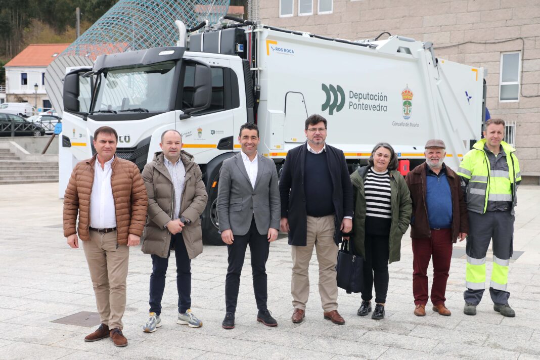 O presidente da Deputación de Pontevedra, Luis López, visitou o Concello de Meaño este luns para coñecer o ben adquirido polo goberno local a través do programa provincial PON2030 consistente nun camión biocompartimentado para a recollida do lixo dos colectores verde e marrón. Unha achega por parte do organismo provincial de máis de 300.000 euros, xunto cos 54.000 euros restantes aportados polo Concello, que serviu para a adquisición deste camión e unha rede de contedores marróns, para a separación dos residuos orgánicos, que será estendida en vindeiras datas polas parroquias do Concello. “A miña primeira visita institucional a Meaño foi para asinar o convenio co alcalde ao abeiro do programa PON2030. Hoxe comprobamos este ben adquirido, que é de última xeración. Meaño vai ser un exemplo a seguir”, asegurou o presidente provincial, que estivo acompañado polo alcalde Carlos Vieitez.