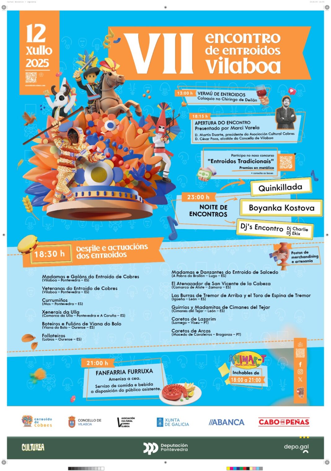 Entroidos tradicionais chegados desde diferentes puntos de Galicia, España e Portugal daranse cita esta fin de semana en Vilaboa no marco do VII Encontro de Entroidos, do que Cobres será un ano máis anfitrión. A cita, que xa se consolidou como unha das propostas culturais máis orixinais do calendario estival, demostra que o entroido tamén ten cabida en pleno verán e que as fronteiras non existen cando se trata de preservar o patrimonio inmaterial.