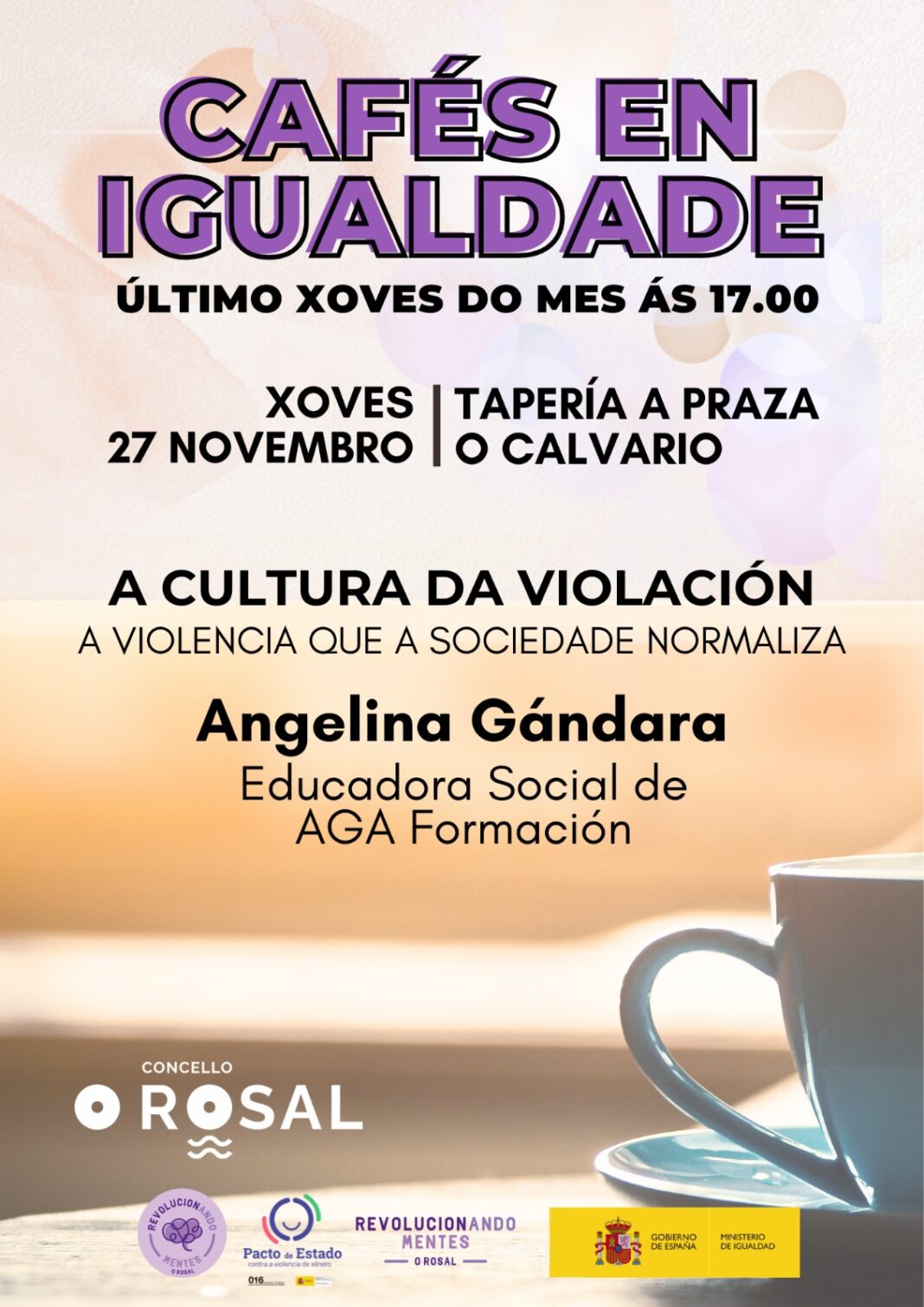 Romper silencios, cuestionar o aprendido e mirar de fronte aquilo que a sociedade tende a normalizar. Esa é a proposta coa que o Concello do Rosal suma unha nova cita dos ‘Cafés en Igualdade’ á programación do 25N, Día Internacional para a Eliminación da Violencia contra a Muller, convidando á veciñanza a reflexionar arredor da charla ‘A cultura da violación. A violencia que a sociedade normaliza’, impartida pola educadora social de AGA Formación, Angelina Gándara. O encontro terá lugar o xoves 27 de novembro ás 17.00 horas na tapería A Praza, no Calvario, con entrada libre e de balde.