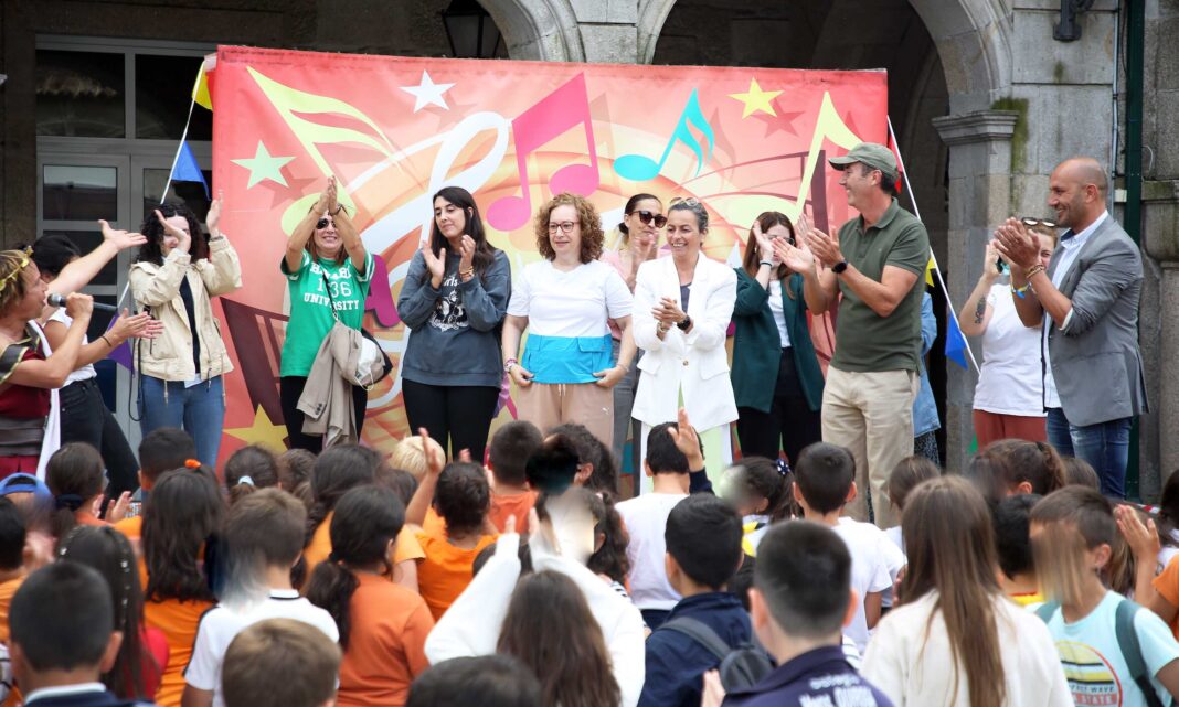 A praza do Arquitecto Antonio Palacios acolleu un espectáculo lúdico musical no que participaron xogando, cantando e bailando os estudantes de terceiro de primaria do CEIPP Antonio Palacios, CEIP Cruz Budiño, CEIPP Atios e CPR Hermanos Quiroga, así como o alumnado de ACEESCA.