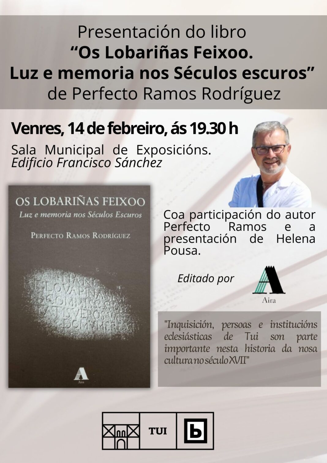 Este venres, 14 de febreiro ás 19.30 h na Sala de Exposicións Municipal, no edificio Francisco Sánchez terá lugar a presentación do libro “Os Lobariñas Feixoo. Luz e memoria nos Séculos escuros” de Perfecto Ramos Rodríguez editado por Aira Editorial. O autor estará acompañado da profesora Helena Pousa Ortega.