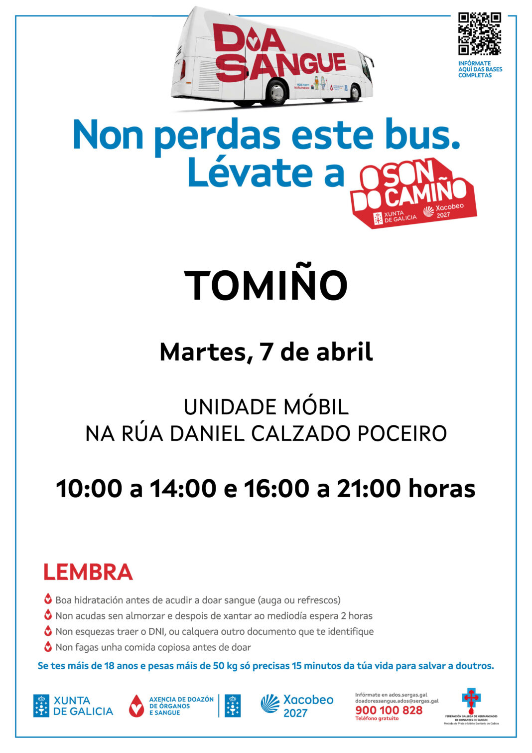 Tomiño regresará da Semana Santa para achegar a súa pinga de solidariedade. Unha unidade móbil da Axencia Galega de Doazón de Órganos e Sangue no municipio visitará o concello o martes 7 de abril para abrir as súas portas ao público que desexe doar na rúa Daniel Calzado Poceiro de 10.00 a 14.00 e de 16.00 a 21.00 horas.