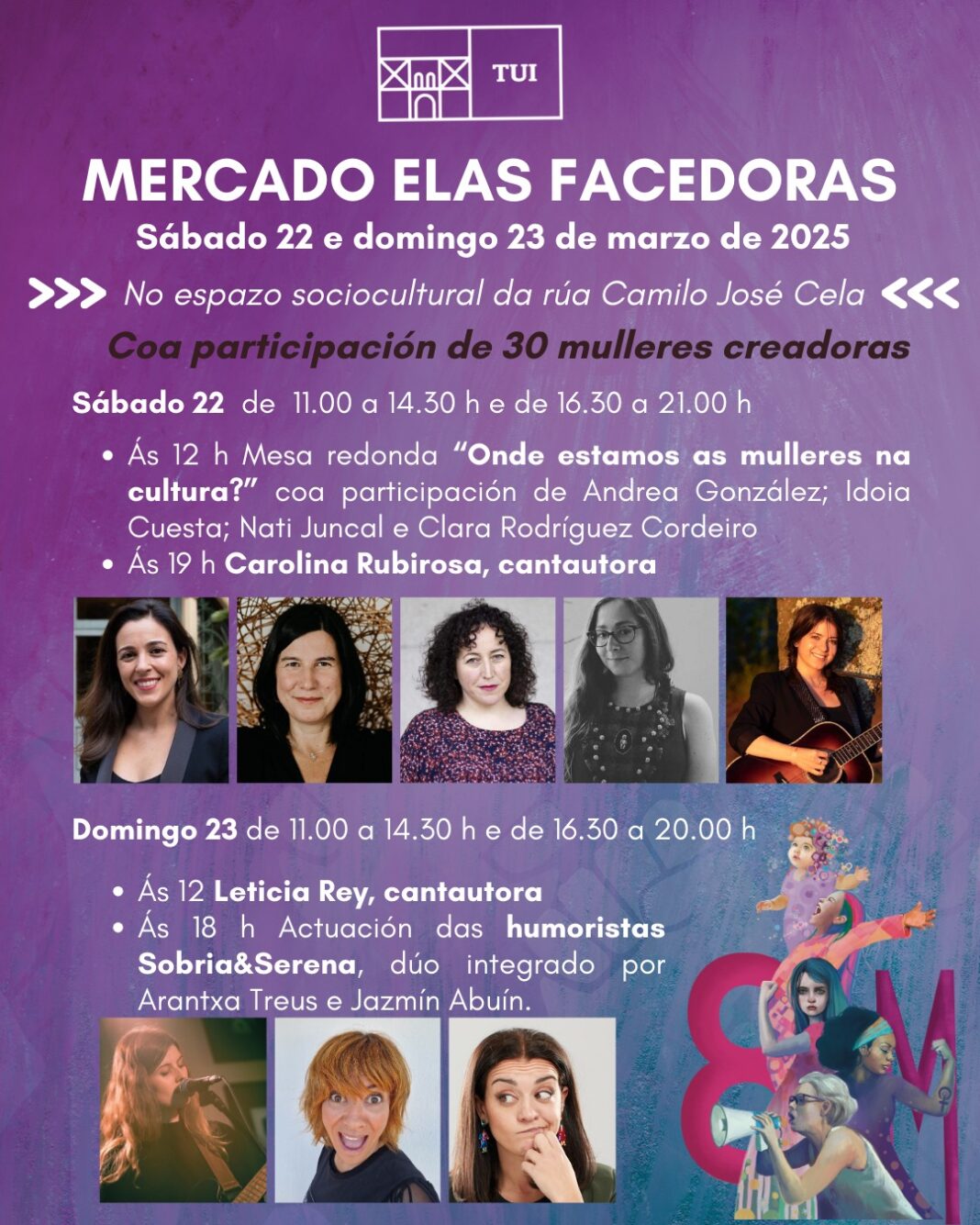 Xa o domingo ás 13 h contarase coa actuación da cantautora Leticia Rey, e ás 18 h das humoristas Sobria&Serena, dúo integrado por Arantxa Treus e Jazmín Abuín.