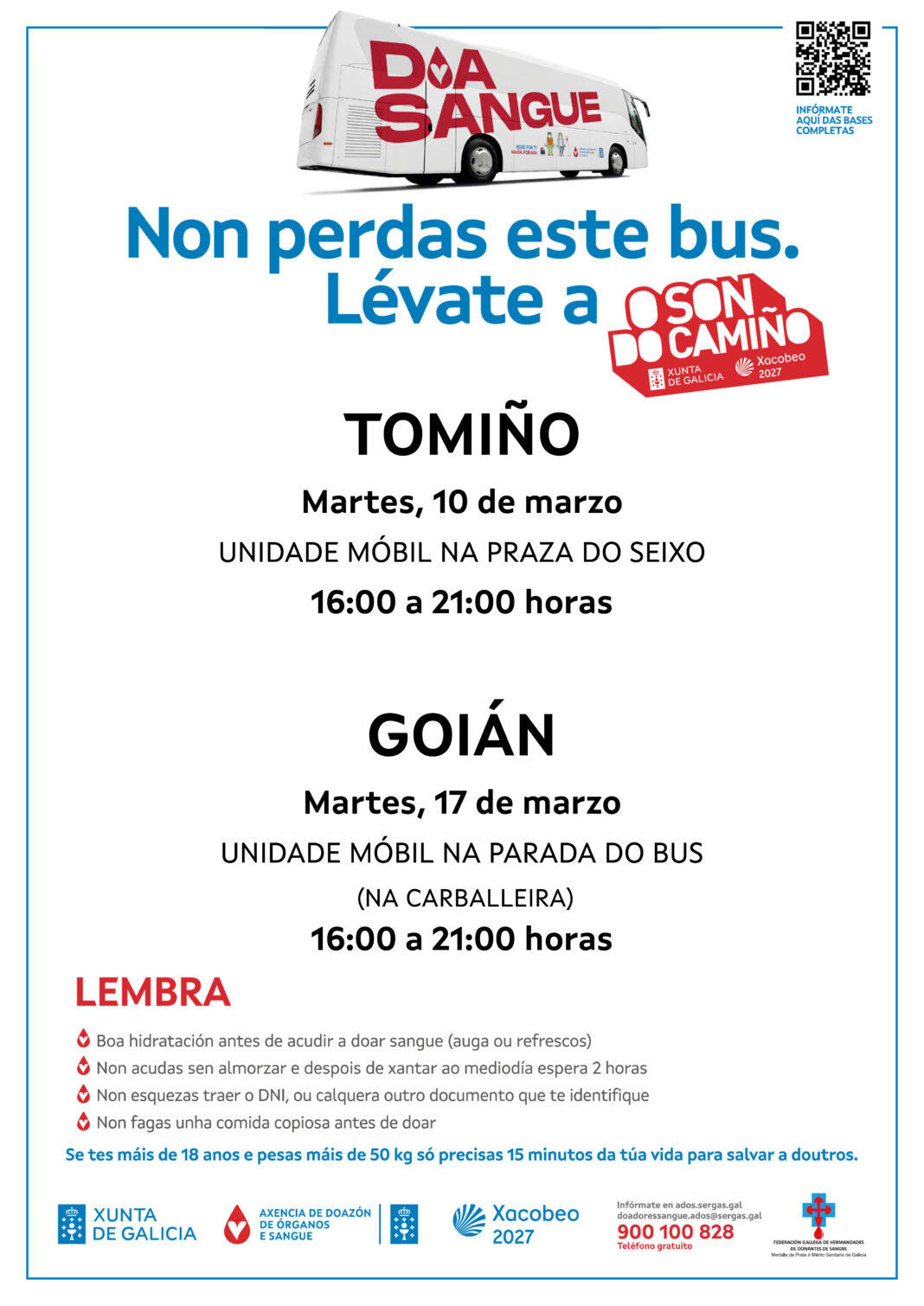 A primavera arranca con dobre cita coa unidade móbil da Axencia Galega de Doazón de Órganos e Sangue no municipio. O vindeiro martes 10 de marzo o autobús estará na Praza do Seixo, mentres que o martes 17 de marzo estará dispoñible na parada do bus na Carballeira de Goián. Estes dous días estará en horario de tarde, de 16.00 a 21.00 horas, coas portas abertas para todas aquelas persoas que queiran achegarse a doar.