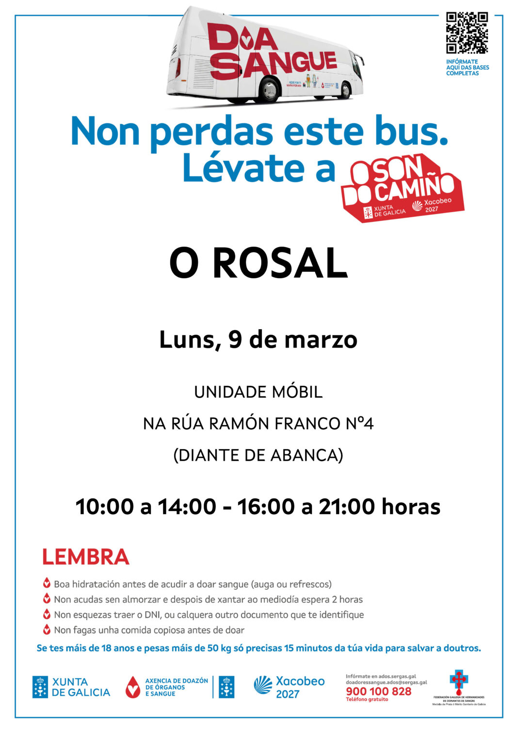 Primavera solidaria no Rosal cunha nova visita dunha das unidades móbiles da Axencia Galega de Doazón de Sangue, Órganos e Tecidos (ADOS). O autobús estará no concello o vindeiro luns 9 de marzo aberto a todas aquelas persoas que desexen doar e deixar unha vez máis a súa pinga de solidariedade. A unidade móbil estará na rúa Ramón Franco número 4, diante da sucursal de Abanca, e abrirá as súas portas nun horario amplo de 10.00 a 14.00 e de 16.00 a 21.00 horas.