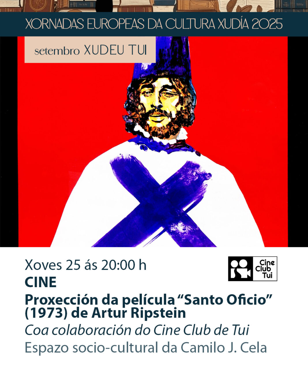 O cinema centra esta semana unha das derradeiras actividades previstas dentro da programación do Setembro Xudeu organizada polo Concello de Tui. Este xoves, 25 de setembro, ás 20 h no Espazo Sociocultural da rúa Camilo José Cela proxectarase o filme “Santo Oficio” realizado en 1973 por Arturo Ripstein. Nesta actividade colabora o Cineclub Tui.