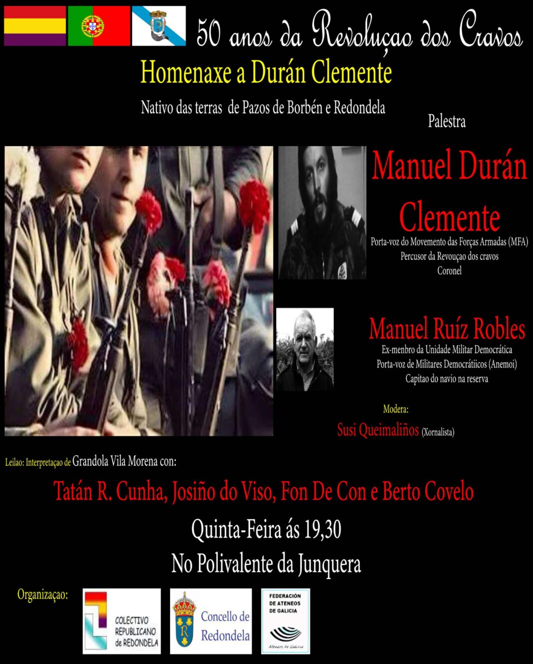 O Concello de Redondela conmemora o 50º aniversario da Revolución dos Caraveis (Revoluçao dos Cravos) cun acto que se celebra este xoves, día 9 de maio. O coronel Manuel Durán Clemente, con ascendencia en Redondela e Pazos de Borbén, recibirá unha homenaxe ás 19.30 horas no auditorio da Xunqueira. Durán Clemente é voceiro do Movemento das Forzas Armadas (MFA), precursor da Revolución dos Caraveis que derrubou a ditadura vixente durante 48 anos en Portugal. El será o gran protagonista desta xornada organizada polo Concello xunto co Colectivo Republicano de Redondela e Federación de Ateneos de Galicia. Haberá unha mesa redonda na que participarán Durán Clemente e Manuel Ruíz Robles, ex-membro da Unidade Militar Democrática e voceiro de Militares Democráticos (Anemoi), e que estará moderada pola xornalista Susi Queimaliños.