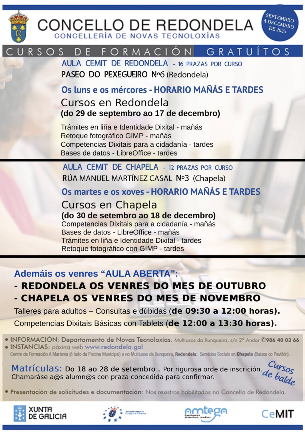 O Concello de Redondela abre o prazo de matrículas do 18 ao 28 de setembro para os cursos de formación en informática de 2025. Ofértanse un total de 112 prazas. Os cursos serán do 29 de setembro ao 18 de decembro de 2025, en horarios de mañás e tardes nas Aula Cemit de Redondela e de Chapela. Son catro cursos diferentes: