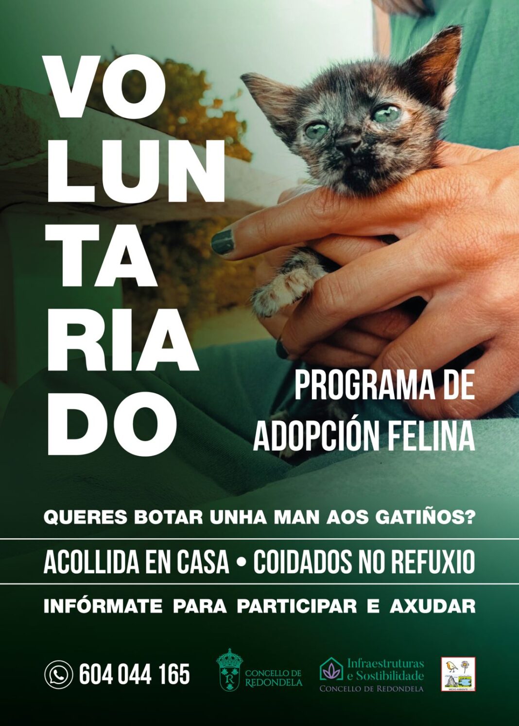 A concellería de Infraestruturas e Sostibilidade pon en marcha unha campaña de voluntariado para que persoas que teñan interese poidan colaborar no Programa de Adopción Felina como “casas de acollida” ou colaborando coas tarefas do refuxio municipal. O concelleiro Roberto Villar explica que, a día de hoxe, xa hai un grupo de voluntarios e voluntarias que colaboran co programa, especialmente co coidado de crías abandonadas.