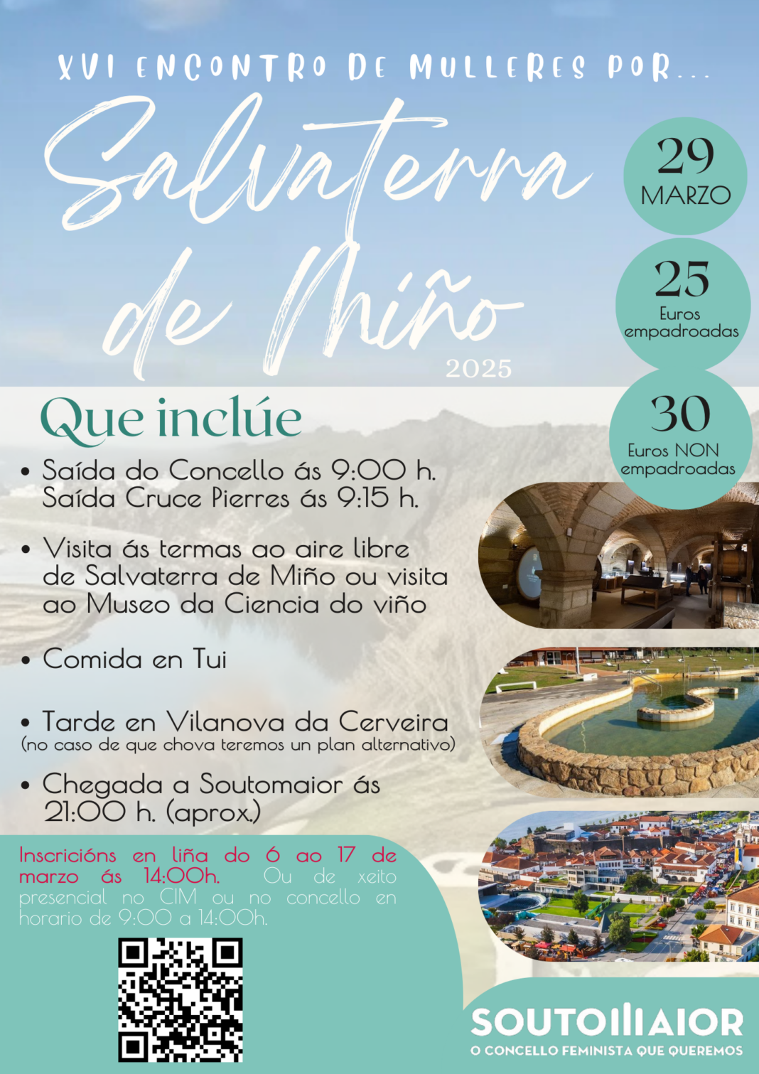 Así, deste modo, para o Encontro do 29 de marzo o autobús sairá ás 9:00h. do concello e ás 9:15h. do cruce de Pierres, en Arcade. Unha vez chegadas a Salvaterra de Miño as asistentes terán a opción de elixir a actividade da mañá que será: as termas ao aire libre de Salvaterra de Miño ou a visita ao Museo da Ciencia do viño.
