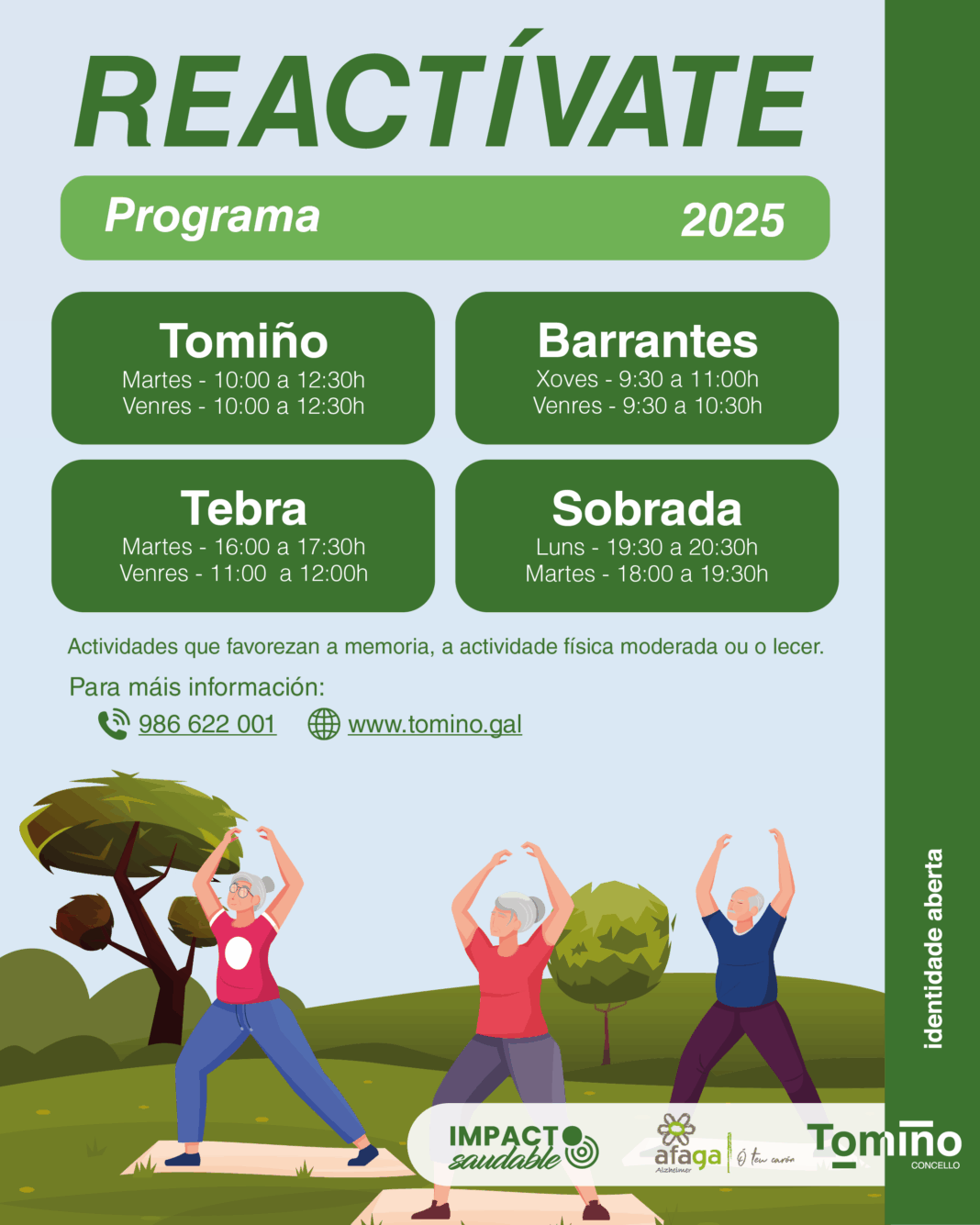 As persoas maiores de Tomiño teñen unha nova oportunidade para coidar corpo e mente. O Concello inicia unha nova edición do programa Reactívate, unha iniciativa de envellecemento activo incluída na axenda Impacto Saudable, que combina actividade física, exercicios de estimulación cognitiva e actividades de lecer para mellorar a calidade de vida das persoas maiores de 55 anos.