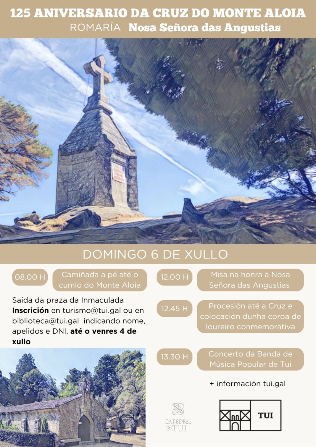 Dende o Concello de Tui convídase a participar neste acto conmemorativo do 125 aniversario da Cruz do Aloia, así coma na Romaría das Angustias que se celebrará como cada ano o primeiro domingo do mes de xullo, mantendo así as tradicións.