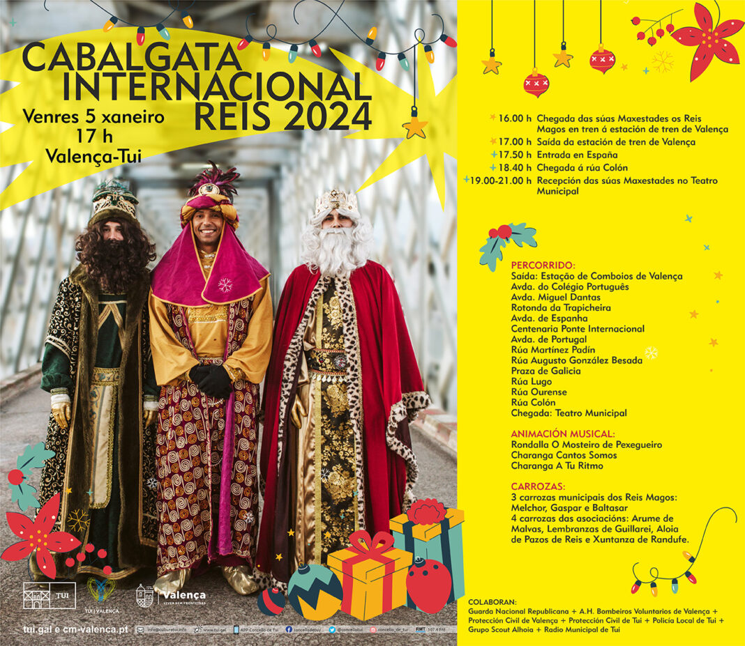 Todo preparado para que as súas Maxestades de Oriente realicen esta tarde un percorrido internacional entre Tui e Valença. Chegarán á Eurocidade en tren, á estación do ferrocarril de Valença ás 16 h da tarde. Unha hora despois, ás 17 h, xunto coa súa comitiva, formada por máis de 200 persoas iniciarán o percorrido que os levará até o centro urbano de Tui. Os Reis irán en tres magníficas carrozas, e na comitiva participan tamén as carrozas das asociacións culturais Arume de Malvas, Lembranzas da Terra de Guillarei, Aloia de Pazos de Reis e Xuntanza de Randufe. Porán música a este evento a Rondalla O Mosteiro de Pexegueiro e as charangas tudenses Cantos Somos e A Tu Ritmo. No seu percorrido repartirán 1.500 quilos de caramelos sen glute.