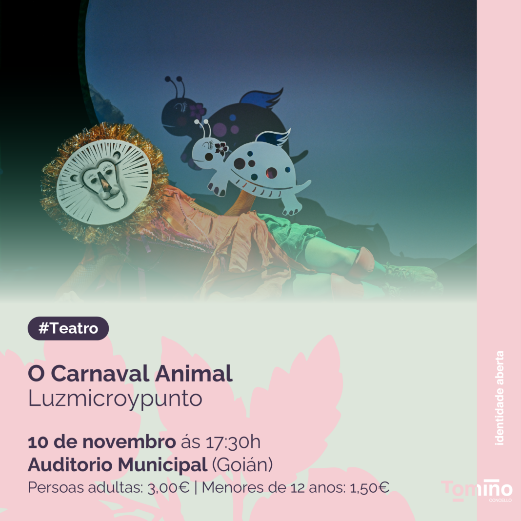 Tomiño énchese esta fin de semana de maxia, disfraces e animais singulares con ‘Carnaval animal’, un espectáculo de Luz, micro y punto co que o teatro para toda a familia regresa un domingo máis ao auditorio municipal de Goián. Este 10 de novembro, ás 17.30 horas, o público poderá desfrutar dunha historia entrañable que promete facer rir e emocionar con esta obra nominada ao Premio Oh! 2024 das Artes Escénicas de Asturias a mellor espectáculo para a infancia.