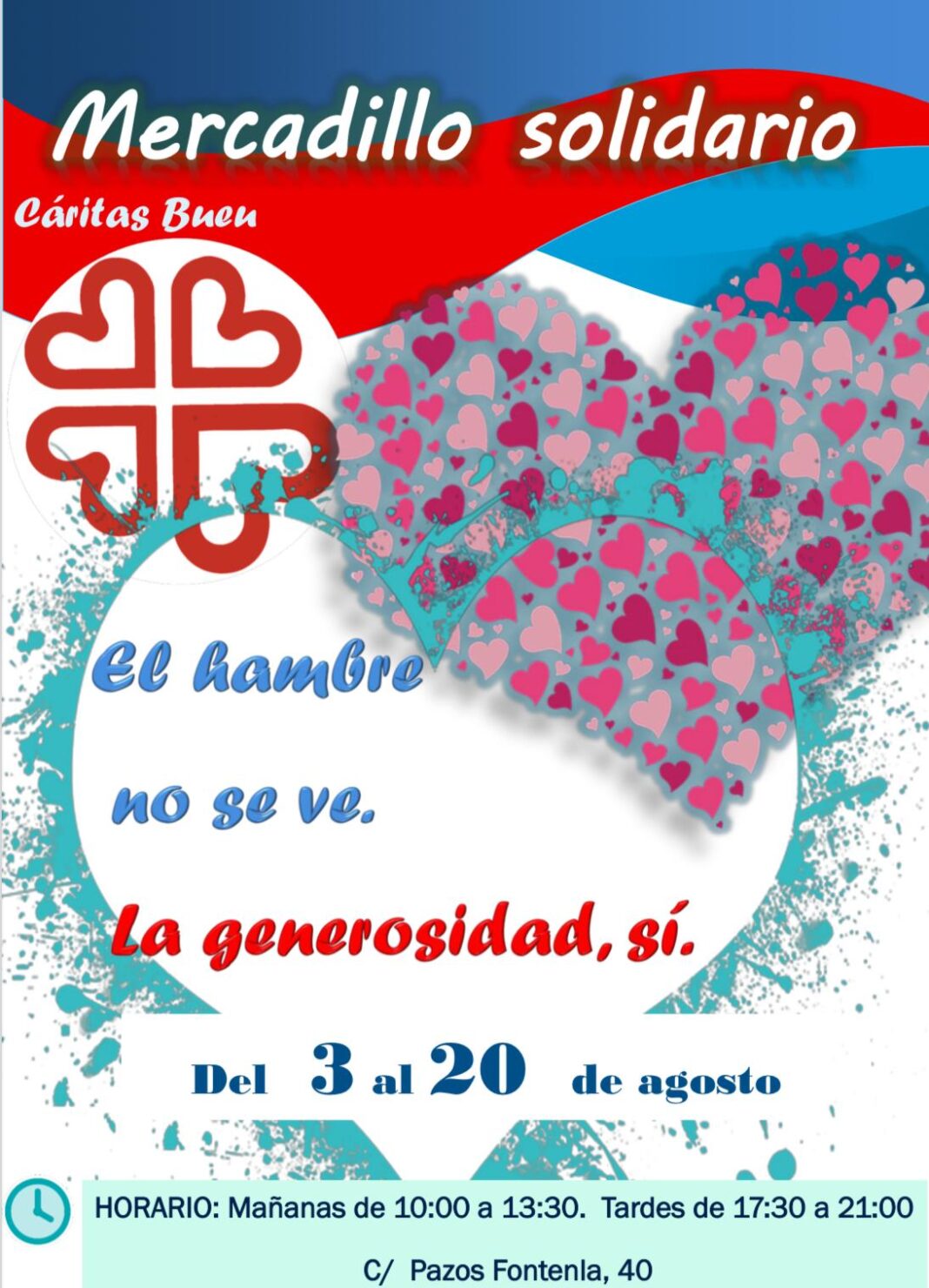 Un ano máis, Cáritas Bueu organiza o mercado solidario de verán, que se desenvolverá do 3 ao 20 de agosto nun baixo comercial da rúa Pazos Fontenla, 40. O horario será de 10.00 a 13.30 e de 17.30 a 21.00 horas, e as persoas que se acheguen poderán facerse, entre outros, con produtos de electrónica, roupa, xoguetes ou libros, que foron doados por persoas particulares e institucións públicas e privadas. Así o salientou Pepe Pais, director de Cáritas Bueu, durante o acto de presentación que tivo lugar este xoves no salón de plenos da Casa do Concello, coa presenza do alcalde de Bueu, Félix Juncal, da concelleira de cultura, Carmen García, e do párroco da vila, José López.