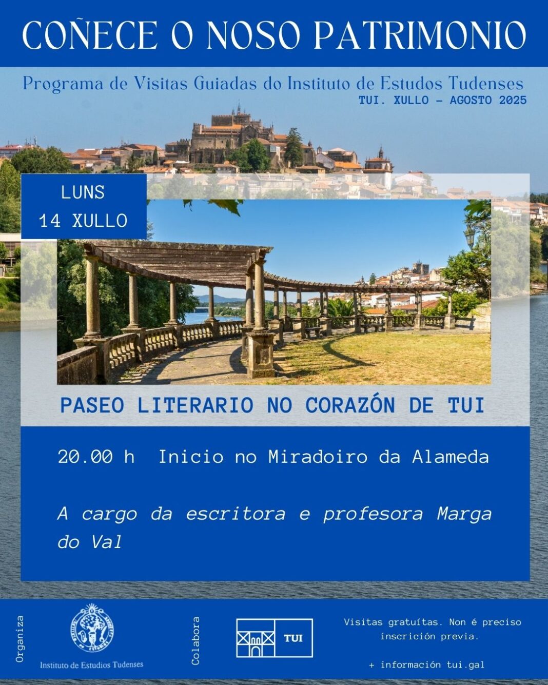 Esta primeira visita consistirá nun “Paseo literario polo corazón de Tui” a cargo da escritora e profesora Marga do Val que realizará un percorrido por diversos lugares da memoria literaria tudense. Comezará ás 20.00 h na Alameda de San Domingos lembrando a figura do poeta da lírica galaico-portuguesa da Idade Media, Golparro. Ao longo do paseo se marcarán diversos fitos vinculados a escritores relacionados con Tui: Camilo J. Cela, os irmáns Álvarez Blázquez, Teodosio Vesteiro Torres, Josep Pla, Manuel Lago, etc recuperando a súa pegada e a súa produción literaria relacionada con Tui e a súa contorna.