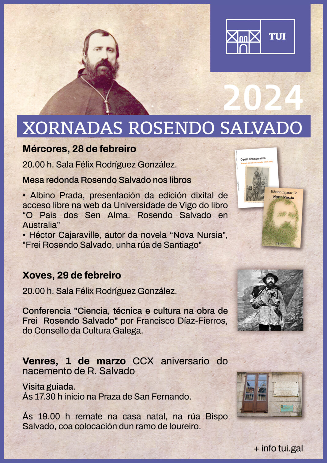 Este mércores, 28 de febreiro, ás 20.00 h na Sala Félix Rodríguez González (no Edificio “Francisco Sánchez” de Tui) comeza unha nova edición das Xornadas Rosendo Salvado que organiza o Concello de Tui en torno ao CCX aniversario da data de nacemento do beneditino tudense, o 1 de marzo de 1814.