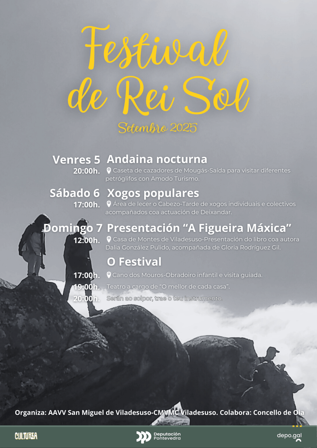 As propostas culturais comezarán á tardiña do venres 5 de setembro, aproveitando as últimas horas de luz para facer un pequeno paseo e unha visita nocturna que percorrerá distintos petróglifos situados no monte comunal de Viladesuso. Guiada polo proxecto local Amodo Turismo, esta experiencia patrimonial baixo as estrelas tratará de dar a coñecer algunhas das representacións máis senlleiras da arte rupestre da parroquia. O punto de encontro será a caseta de cazadores de Mougás.