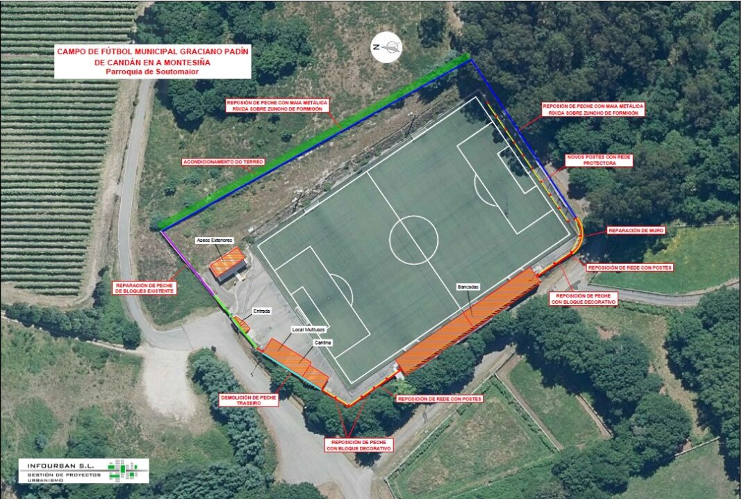 O Goberno de Soutomaior xa ten sobre a mesa o proxecto para reformar por completo o peche exterior do campo de fútbol municipal Graciano Padín, subsanando as numerosas eivas e desperfectos que o muro principal ten desde hai anos e dotándoo dunha estrutura integrada co resto do peche exterior. O proxecto, que terá un investimento de máis de 100.000 euros, tamén contempla o cambio das redes protectoras detrás de ambas as dúas porterías do campo e a renovación do actual sistema de rego.