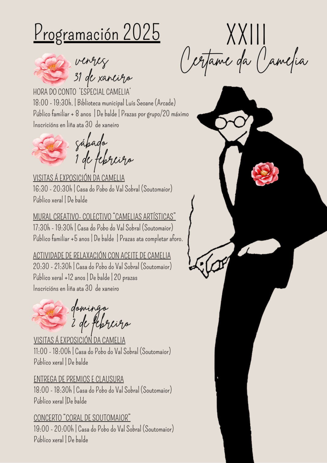 Accións incluídas neste Certame da Camelia 2025: Exposición de flores e composicións de Camelia que se realizarán nos centros educativos do municipio, nos escaparates dos comercios e establecementos e na Casa do Pobo do Val-Sobral; actividades complementarias de dinamización entre as que destacamos a realización dun mural creativo- colectivo “Camelias artísticas”, actividade de relaxación con aceite de Camelia ou o concerto da Coral de Soutomaior que terá lugar o domingo 2 de febreiro.