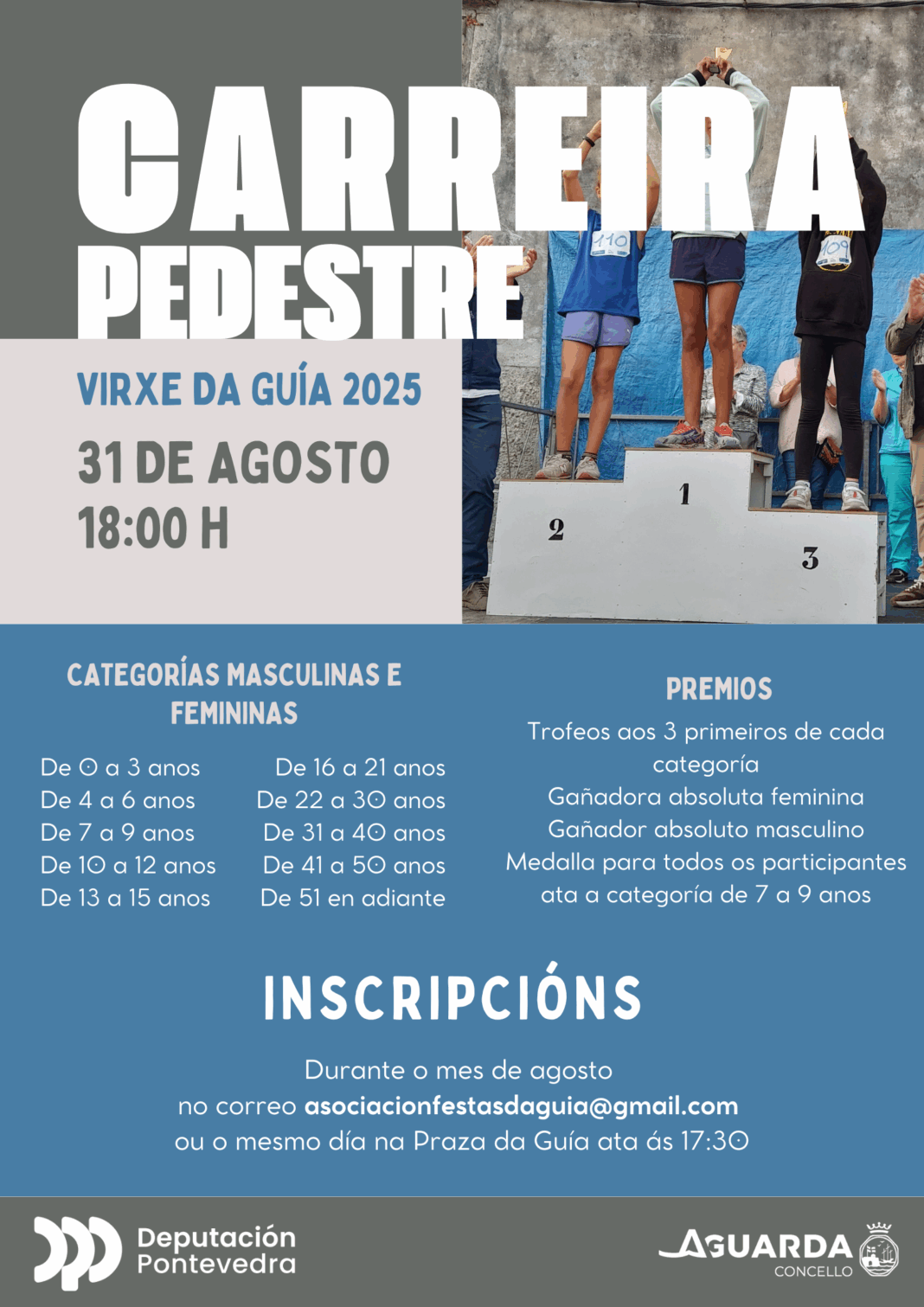 As inscricións xa está abertas, enviando os datos ao correo asociacionfestasdaguia@gmail.com, pero tamén pode facer se o mesmo día da carreira na praza da Guía antes das 17:30h.