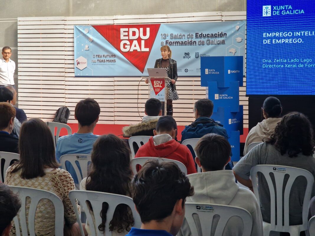 A directora xeral de Formación e Cualificación para o Emprego, Zeltia Lado, acompañada polo delegado territorial da Xunta en Pontevedra, Agustín Reguera, participou na charla Emprego Intelixente (EMi): A intelixencia artificial aplicada á busca de emprego, enmarcada nas actividades de Edugal, 13º Salón da oferta de educación e formación de Galicia. Alí puxo de relevo que esta ferramenta, dispoñible nas 54 oficinas de emprego de Galicia, é pioneira en España e en Europa e ten como fin casar oferta e demanda no mercado laboral e atender as persoas que están buscando activamente traballo ou mellorar o seu emprego actual, contribuíndo a abordar a escaseza de man de obra.
