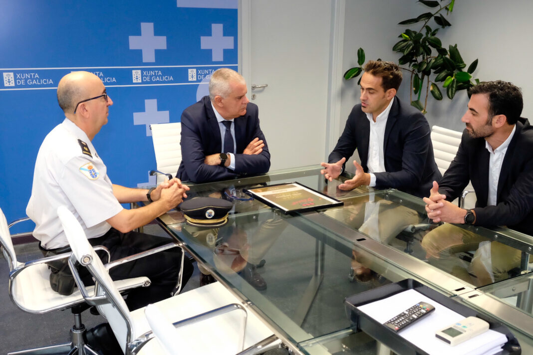 O director xeral de Emerxencias e Interior, Santiago Villanueva, recibiu esta mañá o recoñecemento de mans do director territorial noroeste de Securitas Direct, Javier Iglesias