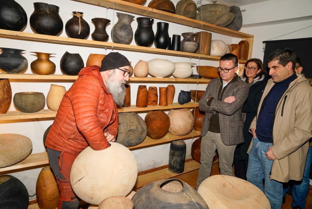 O conselleiro de Emprego, Comercio e Emigración, José González, acompañado polo director xeral de Comercio e Consumo, Gabriel Alén e pola xerente da Fundación Artesanía de Galicia, Elena Fabeiro, visitou esta mañá o obradoiro do artesán Aitor Martínez, especializado na tornería de madeira e recentemente galardoado co Premio Nacional de Artesanía na categoría de produto pola súa colección Mundos.